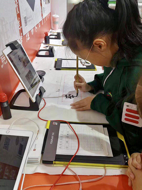 在語博會現(xiàn)場,方正書法吸引了大量觀眾體驗與試用,在學(xué)生群中更是人氣滿滿,北京安外三小的同學(xué)們來到方正電子展臺參觀體驗,使用方正書法練字。